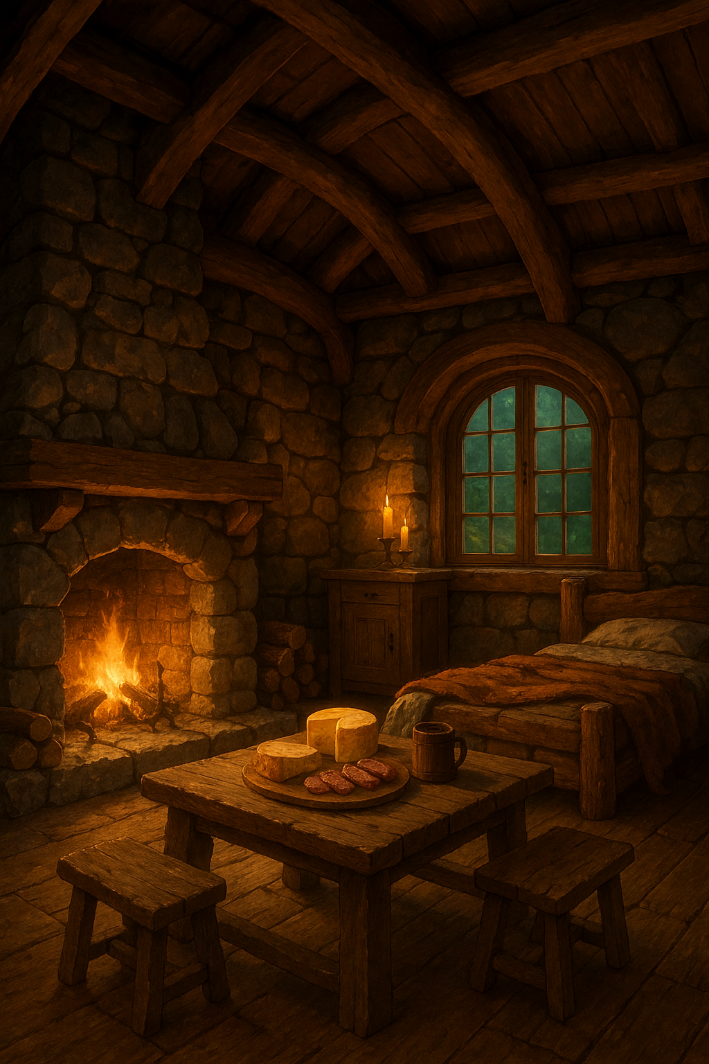 Cozy, fire-lit interior with warm wooden beams, hand-crafted furnishings, and soft amber windows that glow like lanterns in the cavern dusk.